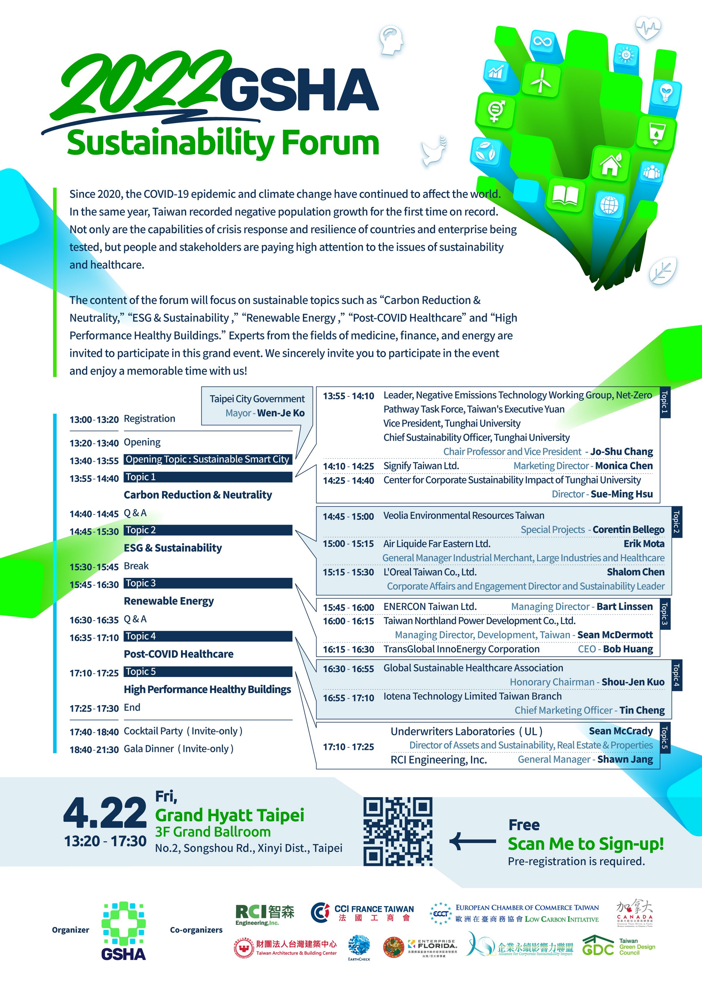 The content of the forum will focus on the following sustainable topics: - Carbon Reduction & Neutrality, - ESG & Sustainability - Renewable Energy - Post-COVID Healthcare - High-Performance Healthy Buildings 2022 GSHA Sustainability Forum