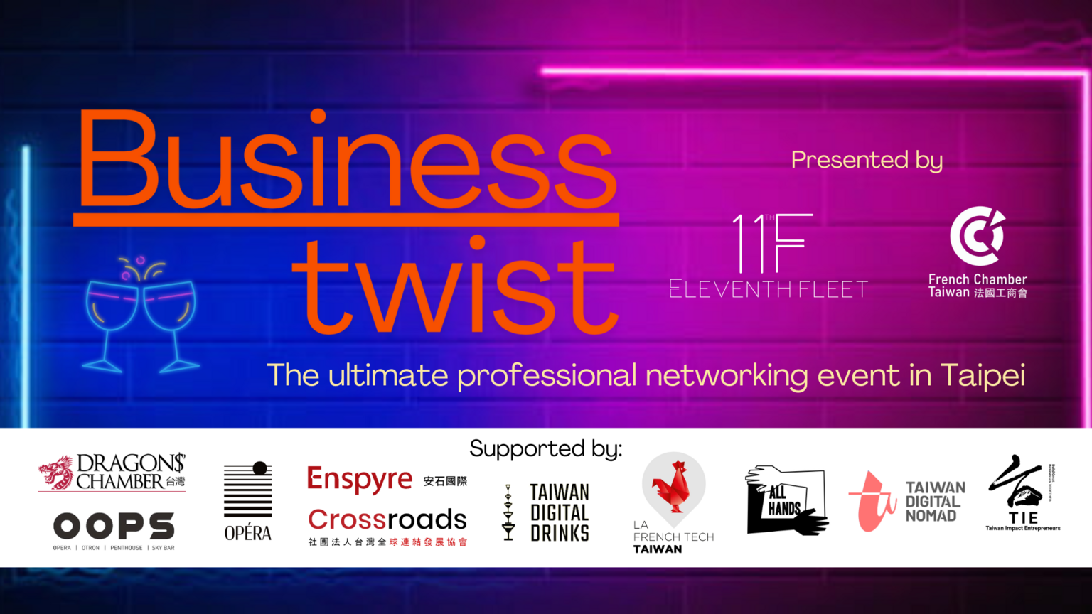 This event is supported by some of the most renowned international and local entrepreneurial communities in Taipei, including Dragon Chamber, Oops Meta Institute, Enspyre, Crossroad, Taiwan Digital Drinks, La French Tech Taiwan, All Hands, Taiwan Digital Nomads, and TIE (Taiwan Impact Entrepreneurs).
