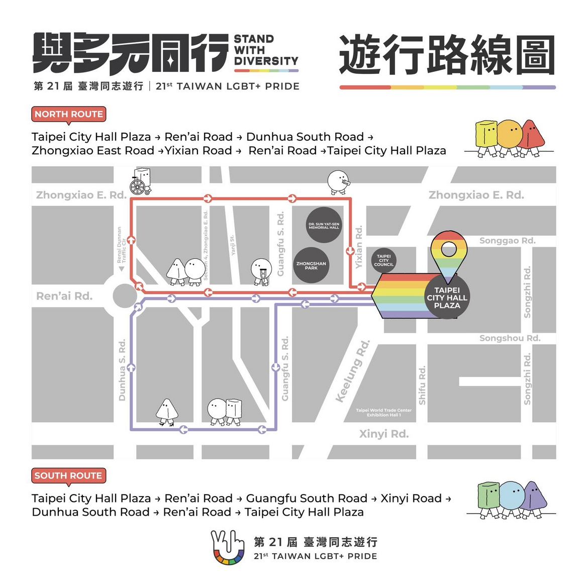 Parade Routes: This year’s parade will start and end at Taipei City Hall Plaza, splitting between North and South Routes which will both lead back to Taipei City Hall Plaza.