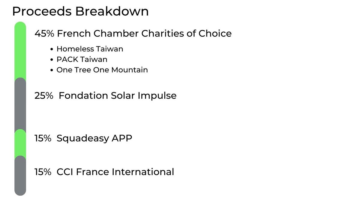 Parts of the event proceeds will go towards Fondation Solar Impulse, joining businesses in taking climate actions via 1000+ clean and profitable sultions. The majority would support local charities of choice, Homeless Taiwan, PACK Taiwan and One Tree One Mountain.