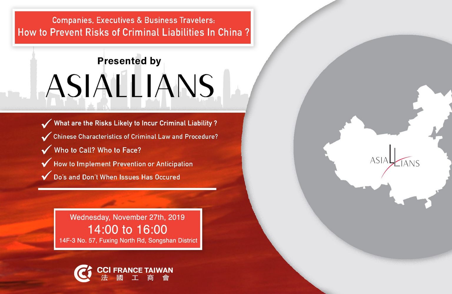 China is no exception: a Company, its representatives, its employees can face criminal liabilities. However, most expatriates remain uninformed about the need for criminal risk management, which is particularly relevant in human resources and labor law, in industrial activities with environmental risks, with a company targeted by an anti-bribery investigation, or simply because a commercial conflict goes wrong or a personal mishap forces police intervention.