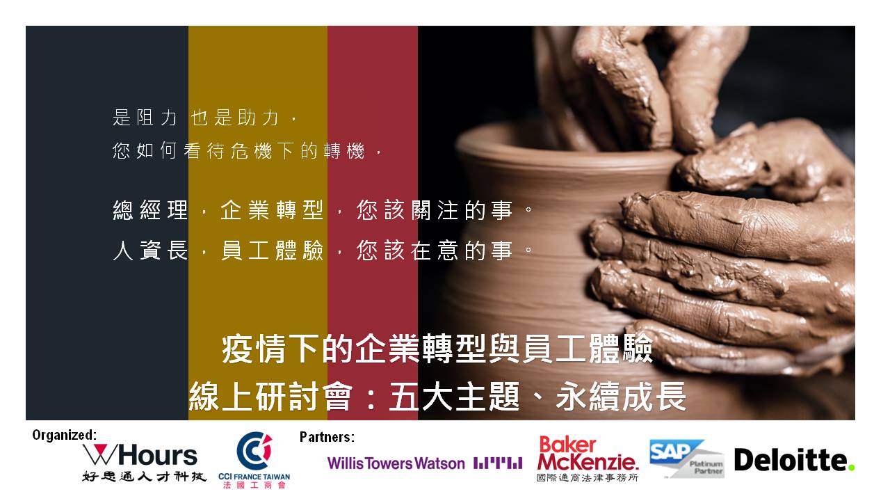 此研討會邀請到了來自韋萊韜悅(Willis Towers Watson)、思愛普軟體系統(SAP Taiwan)、德勤管理咨詢(Deloitte) 、國際通商法律事務所 (Baker McKenzie)wHOURS 好思通人才科技公司等主講人與專家與談人,透過提問與互動,與來賓談論有關於疫情之下,企業如何發揮人資策略夥伴的角色,轉型與強化組織。