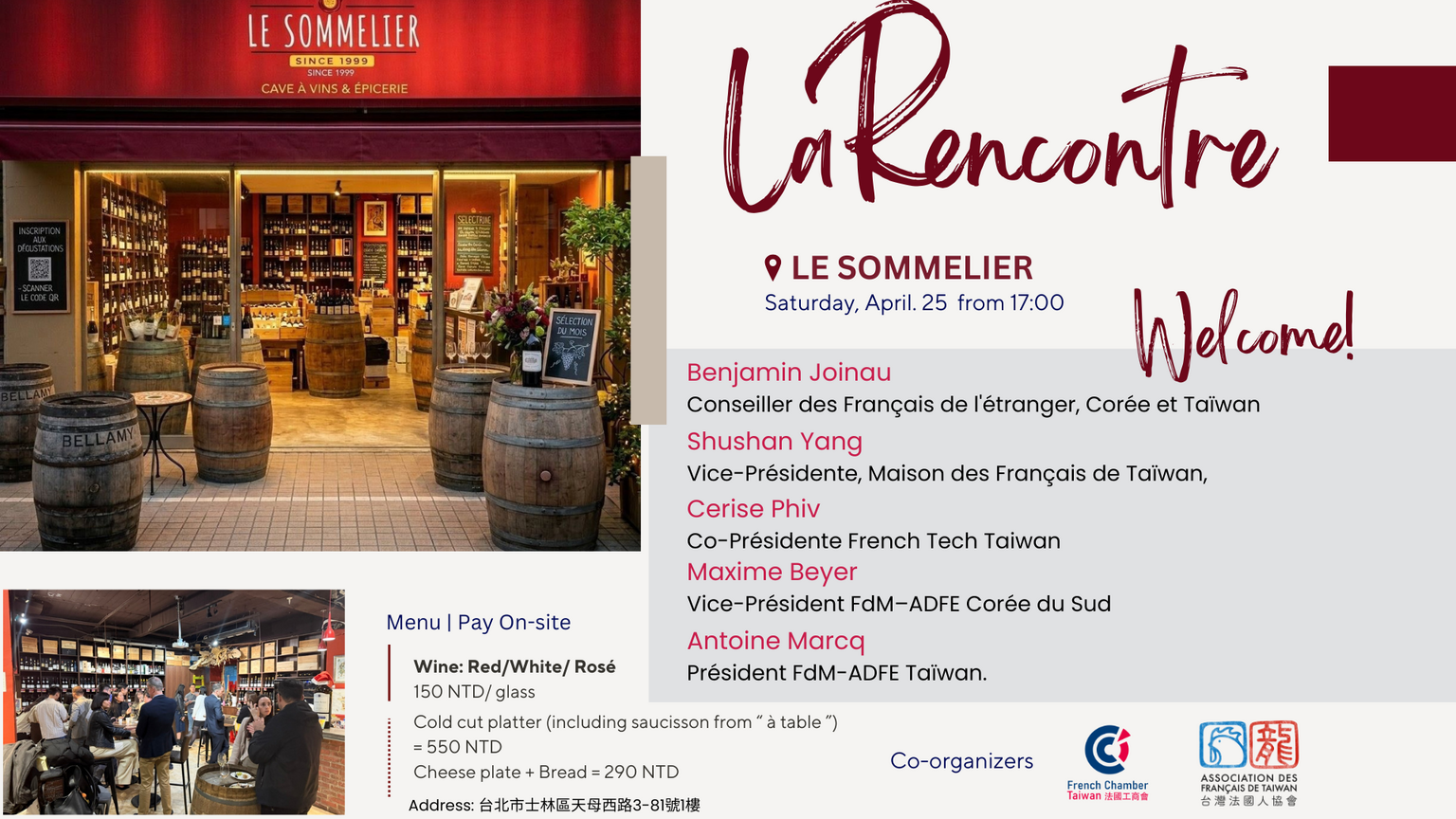 Co-organized by French Chamber Taiwan and the Association des Français de Taïwan.Pay on-site for consumption.