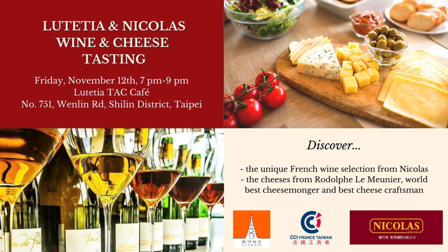 On November 12th, from 7pm to 9pm, with Lutetia Café and Nicolas, the CCIFT will host a Wine & Cheese Tasting event!
