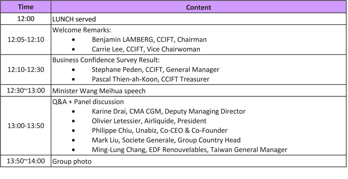 After the introductory welcome by the Chairman and General Manager of the CCIFT, we'd then welcome the minister for a keynote speech, followed by a Q&A session and a lively panel discussion.