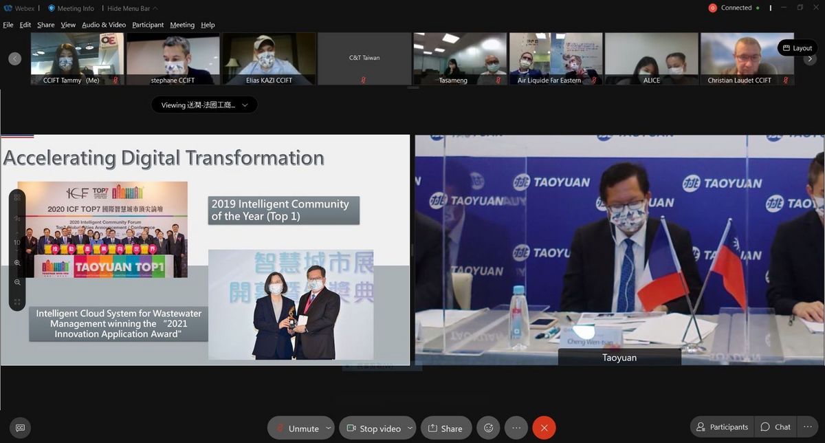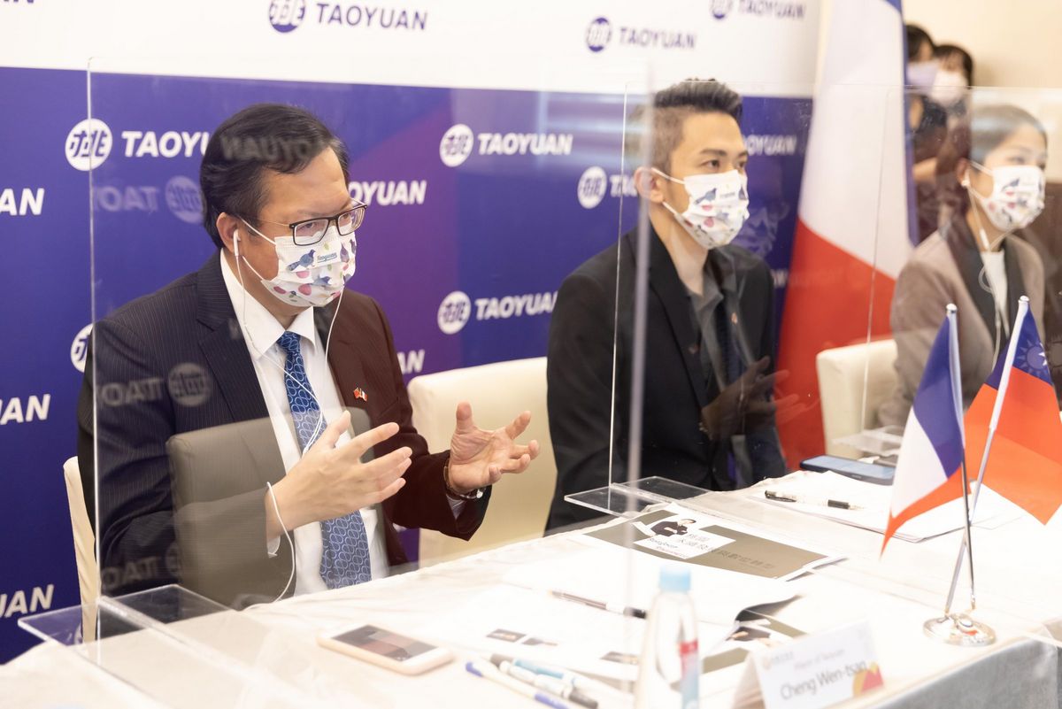 He shared with 32 French business members from high-tech, semiconductor, aerospace, environmental protection, solar energy, logistics, Internet of Things and wine industry about how Taoyuan City' embarks on its journey towards a sustainable smart city through its diverse low-carbon and digital transformation efforts.