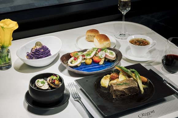 “The Kitchen - An Extraordinary Feast” menu features seasonal delicacies and produce from different destinations during the train tour, each carefully crafted and delivered by Regent Taipei’s top culinary team, and elevated with a twist of Regent’s signature dishes. The menu changes seasonally, thus guests may experience new surprises as they book along the seasons. Regent Taipei stated that “The Kitchen - An Extraordinary Feast” brings together first-class chefs in Regent’s various hotel restaurants, and is the most cross-departmental collaboration in its history. Chefs including Executive Chef of Regent Taipei, Bernard Noël, who has worked in well-known Michelin restaurants in Paris, Executive chef Tony Wu of the Banquet Department, and Grill Chef William Tsai of Robin’s Grill were all involved in the meal planning of this tour. Intricate tablewares were also selected to provide guests with the most complete dining experience.
